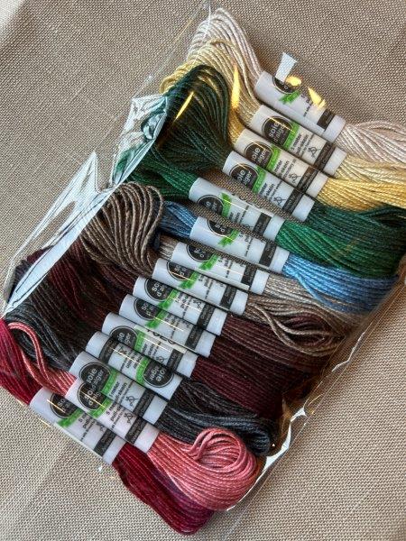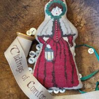 Please note: The linen in your kit is cut to create the stand-up doll, and finishing instructions are available as a free download on my website. A 1/2″ seam allowance is required for this finish and I suggest using a 1″ border for stitching. There is enough thread to stitch the piece and an over one version if desired. The chart for the band of words is an add on gift. The kit does not contain additional materials or instructions to create this spool finish.